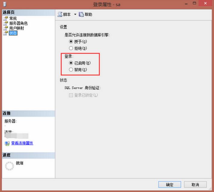 STEP 6. 在“狀態”中,啟用sa登錄,點擊“確定”按鈕