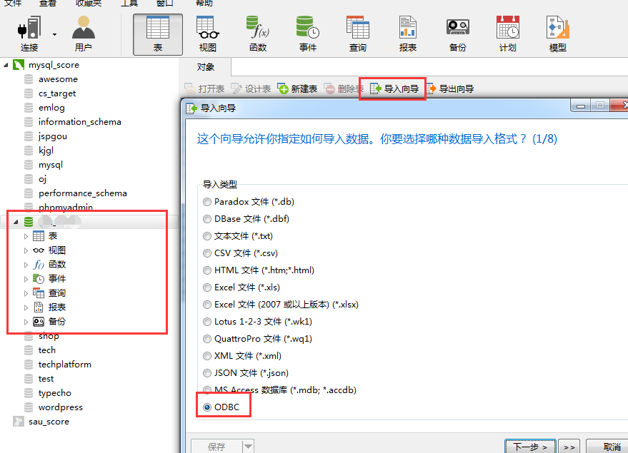 2、雙擊新建的 MySQL 數據庫,選擇 導入向導,選擇 ODBC,下一步。
