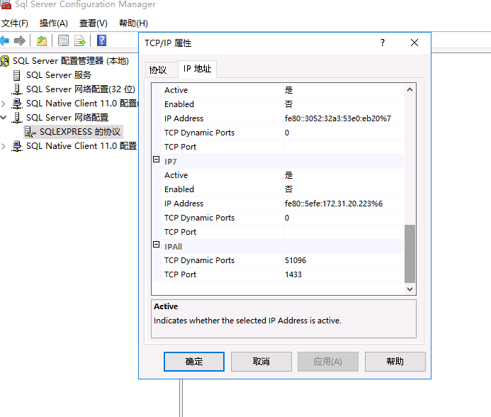 5、打開 SQL Server Configuration Manager,展開 SQL Server 網絡配置,打開 SQLEXPRESS 的協議(我的是 Express 版默認的,其它的找對應的),打開它的 TCP/IP 屬性,在 協議 選項卡中 Enabled 和 Listen All 都選 是,然后在 IP 地址 選項卡中,修改最下面修改 IP1 的配置,把 TCP Port 設置為 1433,確認保存,如下圖。