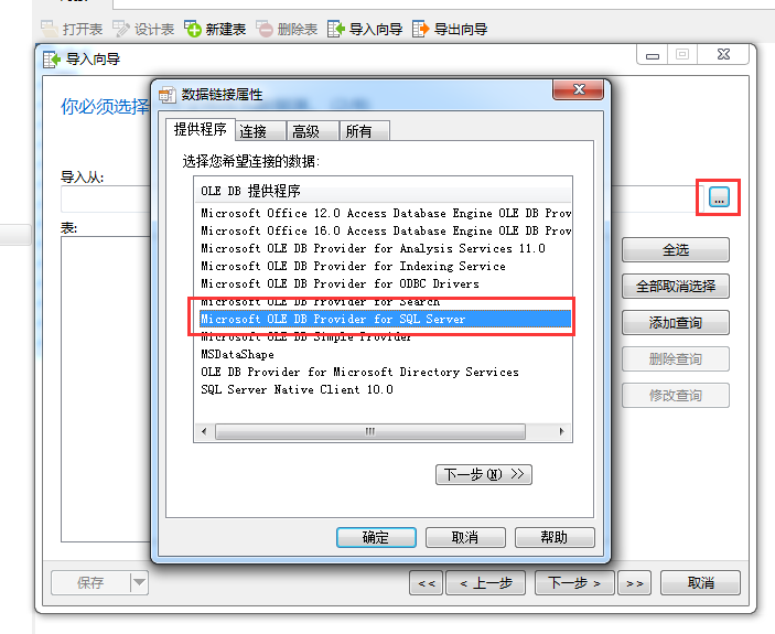 3、在 導入從 的選項中 Microsoft OLE Provider for SQL Server,下一步。