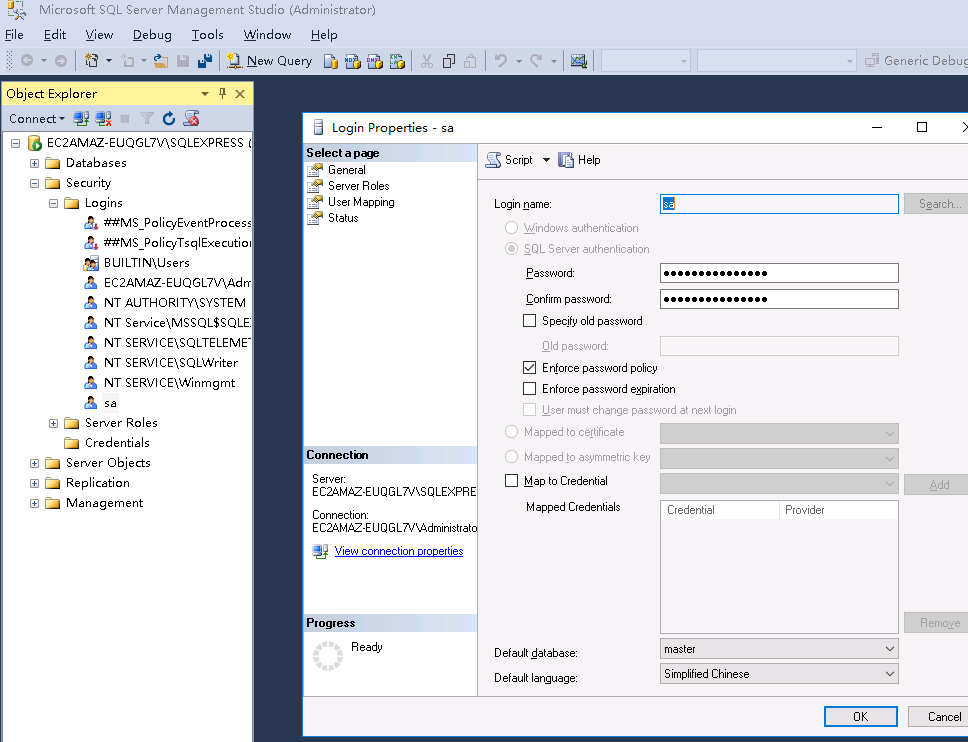 4、在打開的連接中,展開 安全 (Security),展開 登錄名 (Logins),打開 sa 用戶的屬性,設置新密碼并保存。猜測這個 sa 用戶和 Mysql 里面的 root 用戶差不多,我們一會就用這個賬戶和密碼登錄。