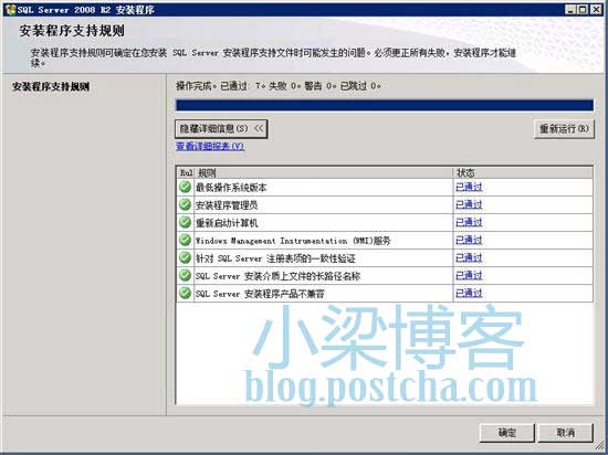 “安裝程序支持規則”頁,前面都是綠色的勾表示都通過了,直接“確定”即可,