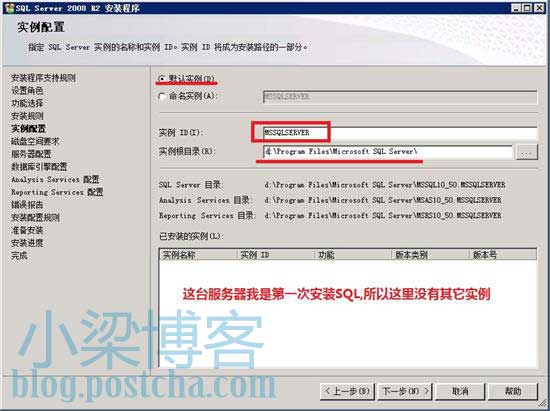 我這臺服務器是第一次安裝SQL 2008 R2,所以直接用默認實例MSSQLSERVER即可。一臺服務器可以安裝多個實例。