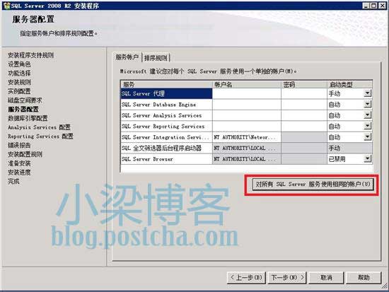 對于SQL的服務帳戶,我都用得是NETWORK SERVICE帳戶,方便管理使用,
