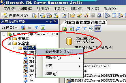 1、新建登錄名:打開 SQL Server 2005 Management Studio Express,并選中“服務器名/安全性/登錄名”,右擊選擇“新建登錄名”,如下圖所示。打開“登錄名 - 新建”對話框。