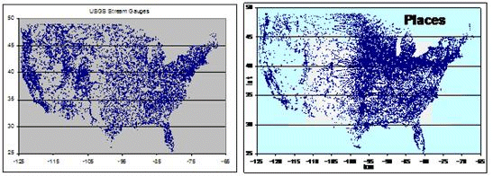 美國地質勘探局 (usgs) 收集并發布了美國的相關數據。圖 3 顯示了由 usgs 維護的 18000 臺用于測量河流水流量和級別的流量計。usgs 還發布了 23000 個地點的地名及其人口的列表。