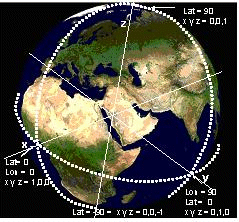 球面上的每個 lat/lon 點都可以表示為三維空間中的一個單位向量 v = (x,y,z)。北極和南極(90° 和 -90°)的單位向量分別為 v = (0,0,1) 和 v = (0,0,-1)。z 代表旋轉軸,xz 平面代表本初(格林尼治)子午線,其經度為 0° 或 180°。正式的定義為: