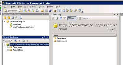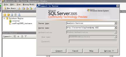 好了,配置基本完成了,現(xiàn)在你可以啟動sql server management studio應(yīng)用程序通過地址 http://crserver/olap/msmdpump.dll連接到 sql server 2005 analysis,如圖