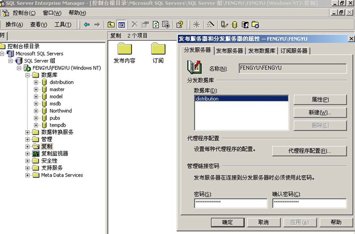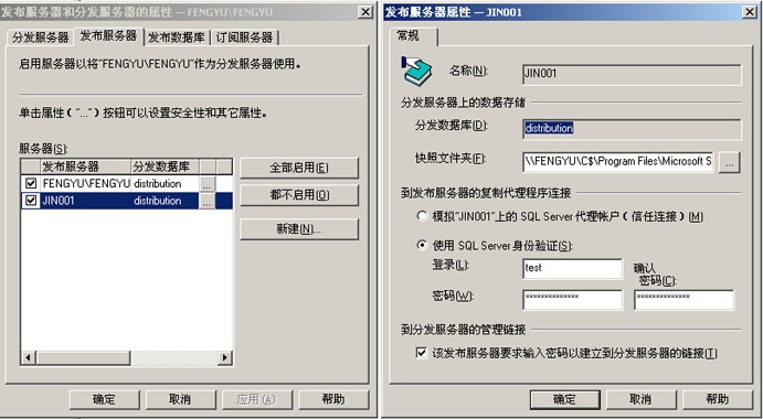 在新建的jin001發布服務器上建立和分發服務器fengyu/fengyu的鏈接的時需要輸入distributor_admin用戶的密碼