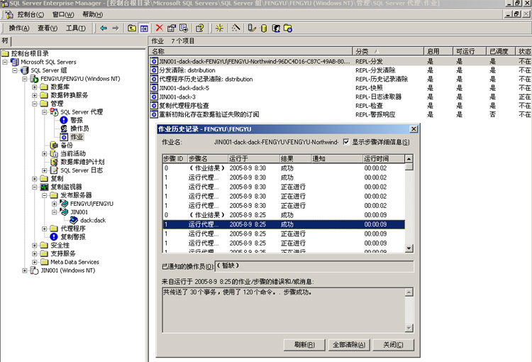 分發服務器sql server服務啟動,網絡接通以后,發布服務器上的堆積作業將按時間順序作用到訂閱機器上: