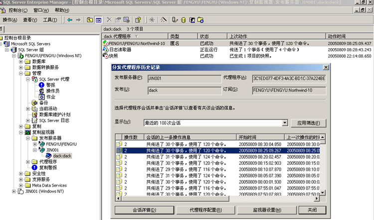已經設好的復制在8:40分以后又開始正常運行了, 發布服務器上的堆積作業將按時間順序作用到訂閱機器上