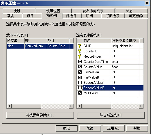 發布表可以做數據篩選,例如只選擇表里面的部分列: