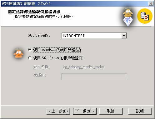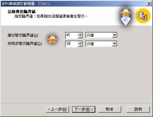 14、記錄傳送臨界值:針對交易日志文件備份動作,以及復制與回存工作,設定合理的延遲時間。當超過臨界時間時,日志傳送監控程序對話框將會響應一個警示訊息。