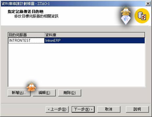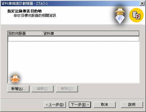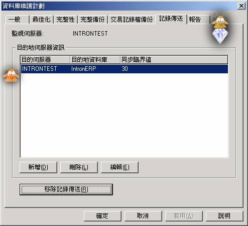 【記錄傳送】設定頁顯示出您先前在維護計劃內設定的日志傳送配對服務器;如果您設定了其它組日志傳送配對服務器,也會列在此處。本設定頁也包含下列選項:新增目的數據庫(用以建立新的日志傳送配對服務器)、刪除既有日志傳送配對服務器、編輯目前的日志傳送配對服務器之屬性,以及移除整個日志傳送功能。