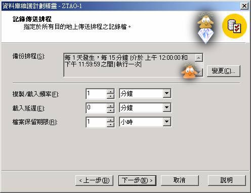 13、記錄傳送排程:可以設定來源數據庫上交易日志文件的備份頻率;也可以設定次要服務器上sql agent工作 (由精靈建立的,用來復制與加載交易日志文件) 的頻率。日志傳送的頻率可粗略設定為一分鐘一次;但以大型數據庫來說,五分鐘一次是比較普遍的選擇。