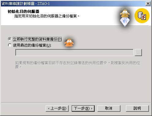 5. 決定如何建立并初始化目的地數據庫。您可以在日志傳送設定過程就先建立與初始同步化目的地數據庫,否則您必須手動進行初始數據庫之回存動作。