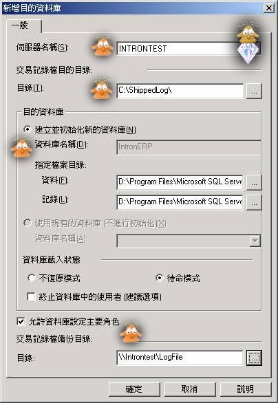 有關數據庫的加載狀態,您有兩種選項可以設定:不復原模式(no recovery mode)與待命模式(standby mode)。所謂的『不復原模式』表示使用者將無法進行資料查詢,唯一可執行的動作只有回存交易日志文件。而『待命模式』則是將數據庫設定成只讀狀態;只要不是在回存數據庫的時候,您都可以查詢資料。窗口內還有一個【終止數據庫中的使用者(建議選項)】選項,會在回存數據庫或是回存交易日志文件時發生動作。在回存數據庫或是交易日志文件時,『回存程序』將是數據庫內唯一的使用者。所以,microsoft建議您勾選此選項,否則其它使用者可能會影響回存動作的進行。