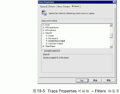 19.2.2 創建跟蹤 在sql server 中可以使用sql server profiler 創建跟蹤,也可以使用跟蹤創建向導或是擴展存儲過程。在這里我們將介紹如何使用sql server profiler 來創建跟蹤。 (1) 啟動sql server profiler (與啟動sql server enterprise manager 一樣),從file 的下拉菜單中選擇new, 再選擇trace 選項,此時打開trace properties 對話框,如圖19-2 所示。 在該對話框中定義跟蹤的名稱、類型、運行跟蹤的sql server 以及跟蹤輸出數據的存儲方式。其中各選項的含義為:
