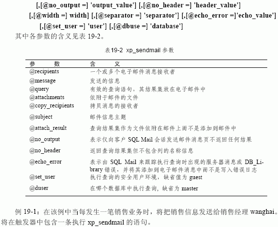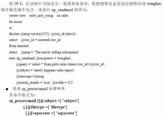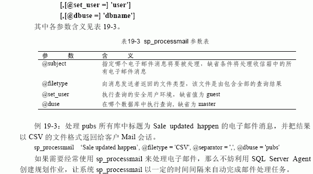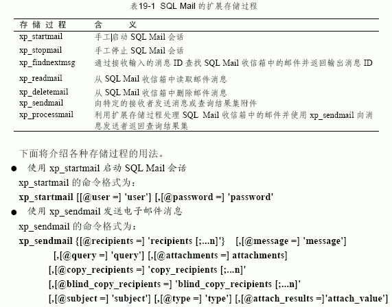 19.1.3 使用sql mail sql mail 中包括許多存儲過程,通過這些存儲過程sql server 能夠接收、發送郵件并對郵件進行處理;也可用這些存儲過程來執行查詢并向接收者返回查詢結果,或對包含查詢或存儲過程的電子郵件做出應答。這些與sql mail 有關的存儲過程及其含義見表 19-1。