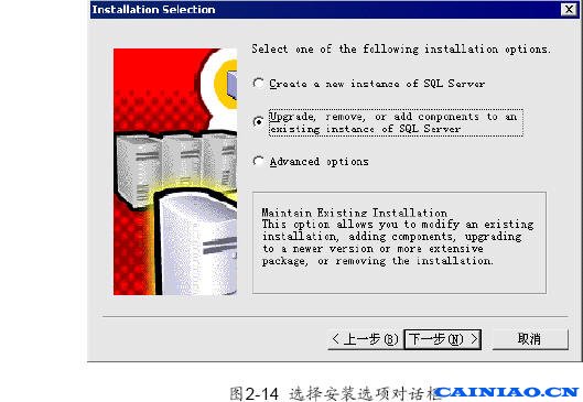2、接下來(lái)出現(xiàn)如圖2-14 所示的選擇安裝選項(xiàng)的對(duì)話框。選擇中間的升級(jí)選項(xiàng)“update,remove,or add components to an existing instance of sql server”