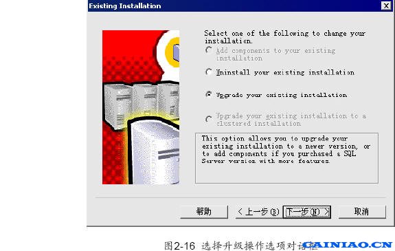 4、接下來(lái)出現(xiàn)如圖2-16 所示的選擇升級(jí)操作選項(xiàng)對(duì)話框。選取如圖所示的“update your existing installation”選項(xiàng)。