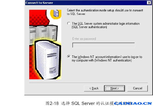 6、接下來(lái)出現(xiàn)如圖2-18 所示的選擇sql server 的認(rèn)證模式對(duì)話框。