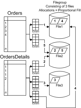 注意:在圖 2 中,一個(gè)文件組包含三個(gè)文件。此文件組中放置了兩個(gè)表,即 orders 和 orderdetails。將表放置到文件組中時(shí),sql server 將根據(jù)文件組中的對(duì)象需要的空間,從每個(gè)文件中獲得盤(pán)區(qū)分配(64-kb 塊,相當(dāng)于八個(gè) 8-kb 頁(yè)面),按比例填充文件組中的文件。創(chuàng)建 orders 和 orderdetails 表時(shí),文件組是空的。創(chuàng)建訂單時(shí),數(shù)據(jù)被輸入到 orders 表中(每個(gè)訂單占據(jù)一行),并且按照每個(gè)明細(xì)項(xiàng)一行的方式輸入到 orderdetails 表中。sql server 將一個(gè)盤(pán)區(qū)分配給文件 1 中的 orders 表,將另一個(gè)盤(pán)區(qū)分配給文件 2 中的 orderdetails 表。orderdetails 表的增長(zhǎng)速度可能比 orders 表快,后續(xù)的分配將轉(zhuǎn)到下一個(gè)需要空間的表中。隨著 orderdetails 表的增長(zhǎng),它將從文件 3 中獲取下一個(gè)盤(pán)區(qū),而 sql server 將繼續(xù)在文件組的文件之間“循環(huán)”下去。在圖 2 中,就是從每個(gè)表到盤(pán)區(qū),再?gòu)拿總€(gè)盤(pán)區(qū)到相應(yīng)的文件組。盤(pán)區(qū)是按照需要的空間進(jìn)行分配的,而根據(jù)流程進(jìn)行編號(hào)。