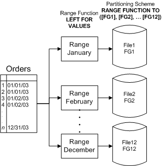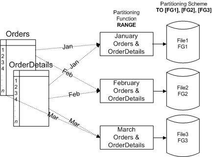 圖 3 顯示兩個(gè)對(duì)象可以使用相同的分區(qū)架構(gòu),而具有相同分區(qū)鍵的所有數(shù)據(jù)行最后將位于同一個(gè)文件組中。對(duì)齊相關(guān)數(shù)據(jù)后,sql server 2005 可以有效地并行處理大型數(shù)據(jù)集。例如,1 月份的所有銷(xiāo)售數(shù)據(jù)(包括 orders 和 orderdetails 表中的數(shù)據(jù))都位于第一個(gè)文件組中,2 月份的數(shù)據(jù)位于第二個(gè)文件組中,依此類(lèi)推。