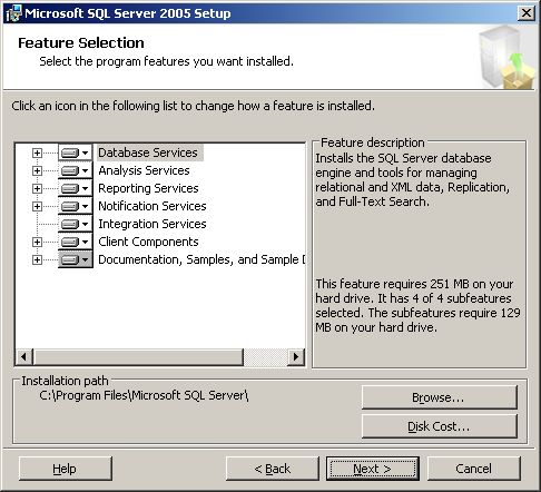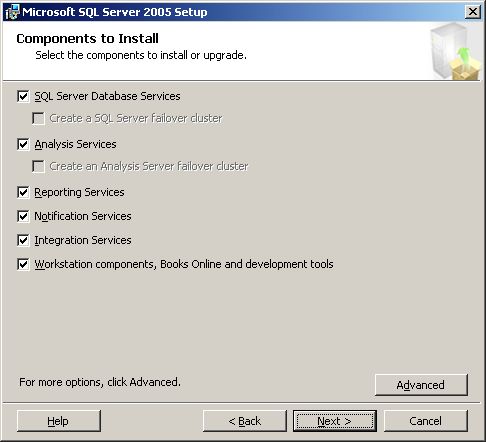 下面實質性的內容才真正開始。在這一畫面里,你需要選希望與sqlserver2005一起安裝的組件。如果這是你的第一臺server,那么就要選上sqlserver數據庫服務(sql server database services)選項。為了保證完整性,我安裝了所有的服務,但是本文不會討論故障轉移集群。如果你想要選擇更加詳細的選項,或者更改默認的安裝路徑(c:program filesmicrosoft sql server),點擊“高級(advanced)”按鈕,然后會彈出一個更加常見的功能選擇窗口。下面的圖e向你顯示的是“組件選擇(component selection)”畫面。在圖f里,顯示的是“高級(advanced)”畫面。在窗口里,點擊“下一步(next)”繼續安裝。