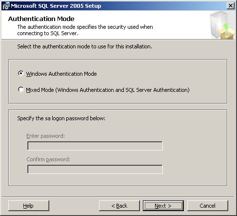 在安裝的下一個畫面(圖i)里,系統會問你是否想要使用混合模式的windows身份驗證(mixed mode authentication),這種模式讓你可以使用sqlserver帳號。除非你有充足的理由不使用,否則最好使用windows身份驗證模式。用戶帳號的維護更簡單,這是你公司潛在安全漏洞較少的一個地方。如果你需要使用混合模式,就要向安裝程序提供你希望系統管理員(sa)帳號使用的密碼。