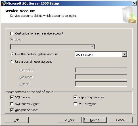 正如以往,sqlserver服務需要使用特定的驗證信息登錄到系統。你可以選擇讓所有的sql服務都共享相同的驗證信息,或者你可以為每個服務都提供自己的登錄驗證信息,我建議在進行更大范圍安裝時使用后面這種方式。但是,在本文里,我讓所有的服務都共享一個帳號,并使用內置的“本地系統(local system)”帳號。