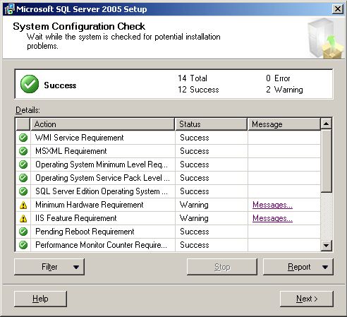 |||當所有需要預先安裝的程序都安裝到你的系統里之后,sqlserver2005的安裝向導就會啟動。安裝向導完成的第一項任務是掃描你的系統,以確保它滿足sqlserver2005的最低要求。在下面的圖c里,你會看到系統檢測提示有兩個方面存在問題。第一個是硬件的最低要求。它之所以出現是因為我是用虛擬機來安裝sqlserver2005的,而虛擬機分配到的內存只有384兆,這個問題很容易解決。第二個是要求具有internet信息服務功能(iis feature requirement),這個有點嚴重。sqlserver2005的一些服務,例如報告服務(reporting services)要求使用iis。所以,繼續安裝之前,我要退出sqlserver2005的安裝過程,再在server上安裝iis。之后,才能繼續進行安裝。