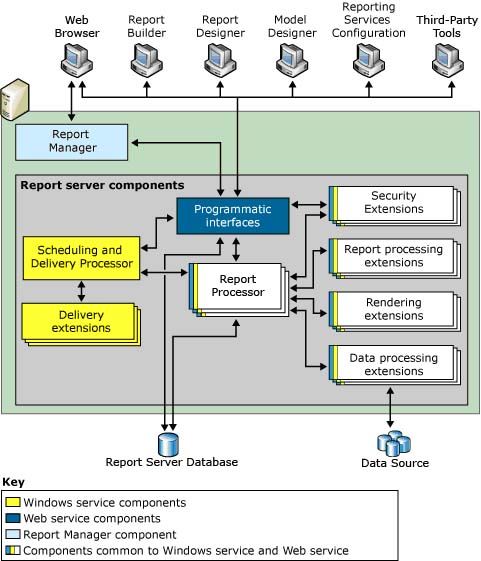 | 客戶應(yīng)用程序 | 客戶應(yīng)用程序通過(guò)soap web服務(wù)和url請(qǐng)求來(lái)訪問(wèn)服務(wù)器。報(bào)表管理工具和報(bào)表查看器應(yīng)用程序是客戶應(yīng)用程序,它們被包含在報(bào)表服務(wù)中。microsoft® visual studio® 2005提供了報(bào)表查看器(report viewer),用來(lái)控制嵌入在客戶端的報(bào)表。報(bào)表創(chuàng)建工具(report builder)是實(shí)時(shí)報(bào)表創(chuàng)建的權(quán)威工具。許多第三方軟件賣主也提供了他們自己的客戶端應(yīng)用程序。 |