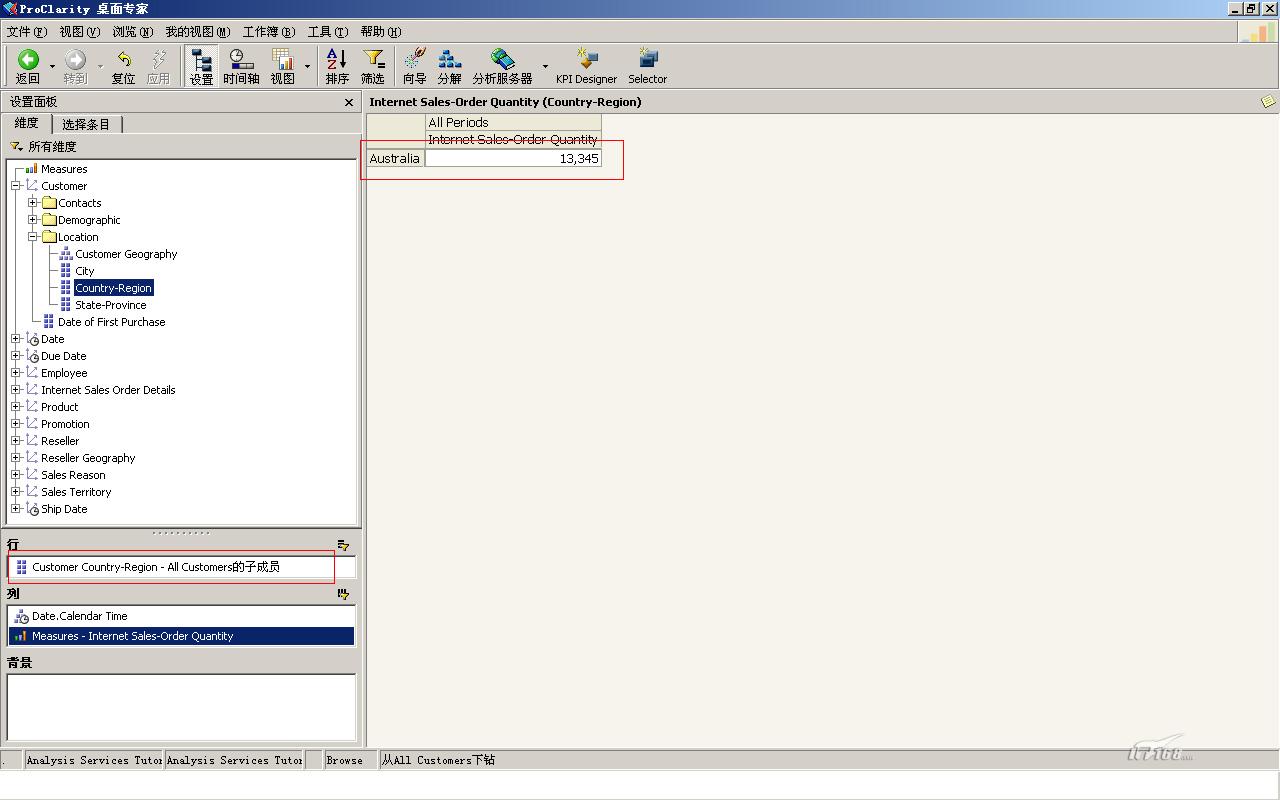 設置成功這后,客戶端軟件(reporting service,或proclarity )以jeffery用戶連上多維數據集,就只能訪問australi的數據如圖7。