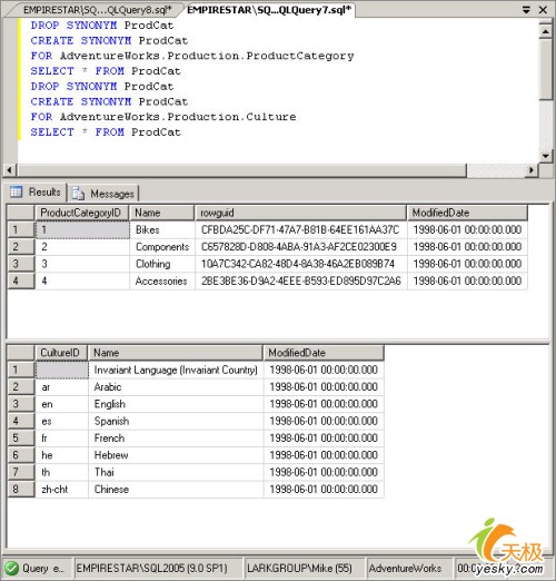注意,當你任何時候想改變一個同義詞時,你需要使用drop和create;不存在alter synonym語句。圖2顯示出運行這個批處理語句的結果。
