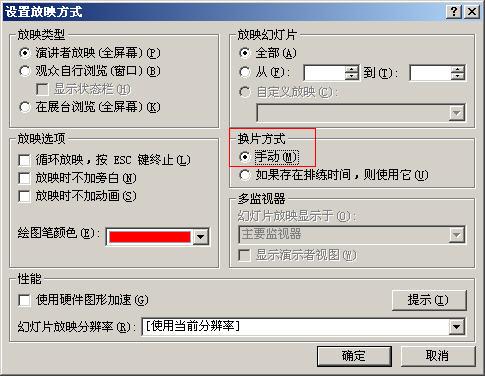 在“換片方式”中,將“如果存在排練時間,則使用它”前面的選項改成“手動”,點“確定”返回即可。