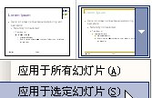 5)在圖標右邊出來一個豎條下拉按鈕,點一下,在出來的菜單中選擇“應用于選定幻燈片”;