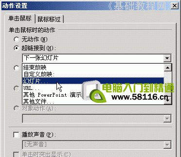 2)在上邊選中第二個圓按鈕“超級鏈接到”,然后在下邊選擇“幻燈片..”;