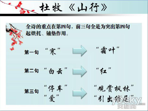 然后把需要重點分析的詩句單獨提出來,以關鍵詞作為引導,利用PPT里的箭頭等符號工具,清晰的表達出重點內容。此外,還需要添加一曲優(yōu)美的背景音樂,讓學生在音樂中放松地閱讀。