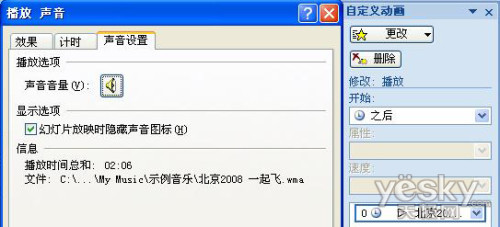 小貼士:添加背景音樂十分簡單,點擊“插入”→“聲音” →“文件中的聲音”,找到你想要添加的背景音樂即可。此外,還可以在自定義動畫的“聲音設置”里面隱藏“小喇叭”圖標。
