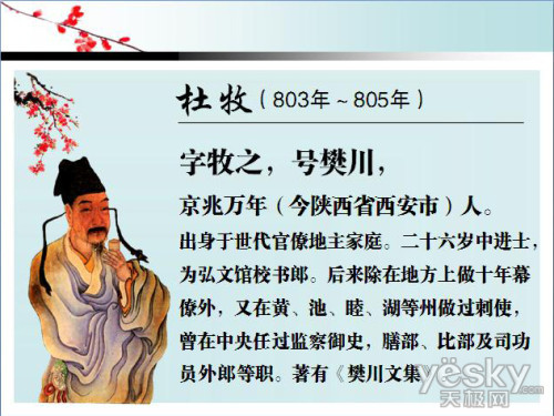 首先介紹出場人物,可以選擇相應的畫作為背景,接著將字體換成書法字(更能烘托古詩的意境),再把詩句和譯句分句并添加動畫,逐行演示出來。