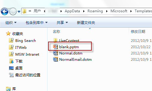 這個時候,如果您是 Windows 7 的用戶,讓我們來檢查一下 C:Users您的用戶名AppDataRoamingMicrosoftTemplates 文件夾下是否存在 blank.pptm 或是 blank.ppt 文檔?