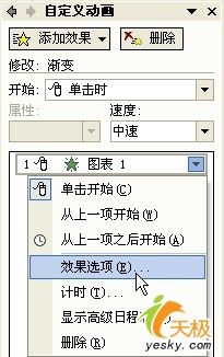 單擊“確定”后,再單擊“自定義動畫”列表中的“漸變 圖表1”的下拉箭頭,在下拉菜單中選擇“效果選項”命令,如圖3。