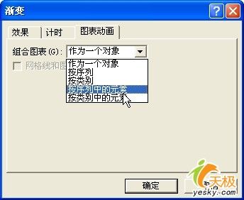 在彈出的“漸變”對話框中選擇“圖表動畫”選項卡,然后單擊“組合列表”框右側的下拉按鈕,在彈出的下拉列表中選擇“按序列中的元素”項,如圖4,單擊“確定”按鈕后就可以預覽動畫的效果了。