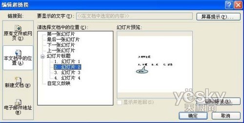 第三步:在試題頁選中A選項(xiàng)右擊鼠標(biāo),在彈出的快捷菜單中點(diǎn)擊“編輯超鏈接”命令,彈出“編輯超鏈接”對話框,在“鏈接到”選項(xiàng)中點(diǎn)擊“本文檔中的位置”,在“請選擇文檔中的位置”選項(xiàng)中點(diǎn)擊“幻燈片標(biāo)題”下與A選項(xiàng)對應(yīng)的評語所在幻燈片,為免出錯(cuò),可在幻燈片預(yù)覽中查看(如圖2),點(diǎn)擊“確定”按鈕。這時(shí)對A選項(xiàng)的超鏈接就設(shè)置好了。根據(jù)同樣的原理,我們可以對B、C選項(xiàng)分別進(jìn)行設(shè)置。
