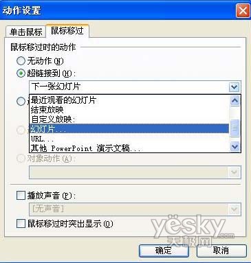 在選項(xiàng)A評語頁選中選項(xiàng)A右擊鼠標(biāo),在快捷菜單中點(diǎn)擊“動作設(shè)置”命令,彈出“動作設(shè)置”對話框,點(diǎn)擊“單擊鼠標(biāo)”標(biāo)簽卡,在“單擊鼠標(biāo)時(shí)的動作”選項(xiàng)中點(diǎn)擊“無動作”;在“鼠標(biāo)移過”標(biāo)簽卡中單選“超鏈接到”命令,點(diǎn)擊“超鏈接到”選項(xiàng)的下拉按鈕,在下拉列表中選擇“幻燈片…”命令(如圖3),彈出“超鏈接到幻燈片”對話框,在“幻燈片標(biāo)題”選項(xiàng)中選擇試題頁(也就是幻燈片1),點(diǎn)擊“確定”按鈕關(guān)閉“超鏈接到幻燈片”對話框,點(diǎn)擊“確定”關(guān)閉“動作設(shè)置”對話框。根據(jù)同樣的原理,我們可以對B、C選項(xiàng)評語頁分別進(jìn)行設(shè)置。