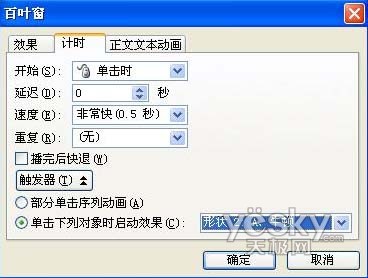 第三步:選中A選項(xiàng)評語(“正確!”文本框),右擊鼠標(biāo)在彈出的快捷菜單中點(diǎn)擊“自定義動畫”命令,出現(xiàn)“自定義動畫”任務(wù)窗格,點(diǎn)擊“添加效果-進(jìn)入-百葉窗”命令。在任務(wù)窗格的動畫序列中點(diǎn)擊“橢圓形標(biāo)注5:正確!”右邊的下拉按鈕,然后在彈出的快捷菜單中點(diǎn)擊“效果選項(xiàng)”命令,打開“百葉窗”對話框,選擇“計(jì)時(shí)”標(biāo)簽卡,單擊“觸發(fā)器”按鈕,單選“單擊下列對象時(shí)啟動效果”選項(xiàng),點(diǎn)擊其右邊的下拉按鈕并在下拉列表中選擇“形狀2:A、牛頓”選項(xiàng),如圖5所示。點(diǎn)擊“確定”返回。