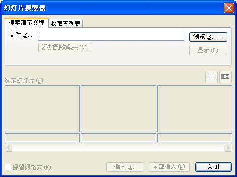 步驟二、在彈出的“幻燈片搜索器”話框中單擊瀏覽,選擇要調(diào)用的文檔;