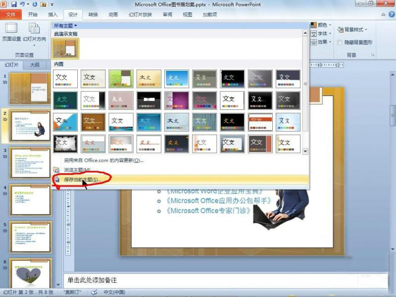 如果對(duì)自己選擇的主題效果滿意的話,還可以將其保存下來,以供以后使用。在主題選項(xiàng)組中單擊其他按鈕,執(zhí)行保存當(dāng)前主題命令。