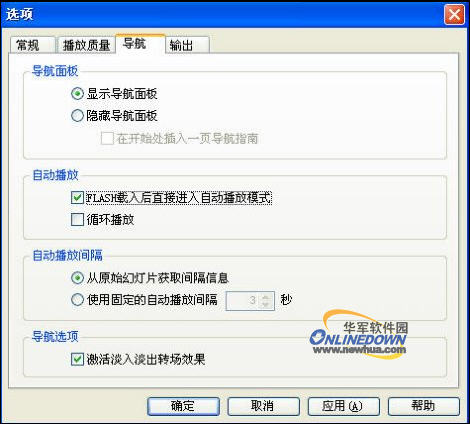 為了方便演示,需要為將生成的SWF文件添加播放的導(dǎo)航條。方法:單擊左側(cè)的“選項”按鈕彈出“選項”設(shè)置對話框。選擇“導(dǎo)航”選項,將下面的“導(dǎo)航面板”一欄中的“顯示導(dǎo)航面板”項選中即可。為使生成的文件可以自動播放,需要對其進行一下相關(guān)設(shè)置。在“自動播放”一欄下選擇“Flash載入后直接進入自動播放模式”。在“自動播放間隔”選項下,選擇“從原始幻燈片獲取間隔信息”項。如果想控制幻燈播放的間隔時間需要選擇下一個選項“使用固定的自動播放間隔”,并在后面的空格內(nèi)填寫適當?shù)拈g隔時間(圖3)。